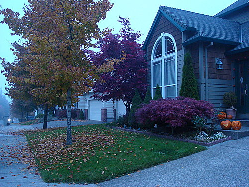 由於昨晚刻完南瓜燈時,天色很黑,時間也晚,所以今天早上P姊和P哥出門搭校車時,P媽順便幫南瓜燈拍幾張"外景"。