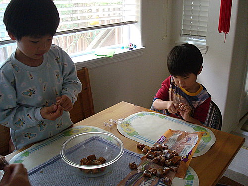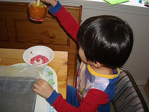 <p>裹好牛奶糖的蘋果,我放在做點心的蠟紙上(防沾黏),然後放進冰箱冰約半天,牛奶糖硬些才拿出來吃.</p>