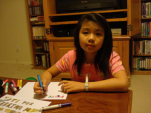 P哥是低年級,所以沒有競選與投票權,但是仍舊很賣力的幫忙畫海報拉票,雖然常常拼錯字得從新再畫,P哥卻不曾有怨言。P媽認為能夠從小開始學習公平競爭,認真的參與選舉,這是民主素養培育的最好方式。