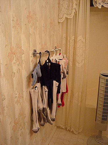 P爸說烘衣機用了十幾年,壞了也只好換新,但是得做機型、價格、功能等比較的功課之外,還得找個運送、安裝、清理舊機費都合理的零售商,這些是需要一兩天的時間。至於眼前的一堆濕答答的衣服,就綁條曬衣繩之類的晾起來。可是P媽樓上樓下找了數十回,就是找不到可以綁繩子的地方,所以最後只好掛在客房浴室用風扇吹乾。(如果現在是夏天就好,晾在後院一會就乾了,但現在晾在後院,就只有等著穿冰柱的份。)