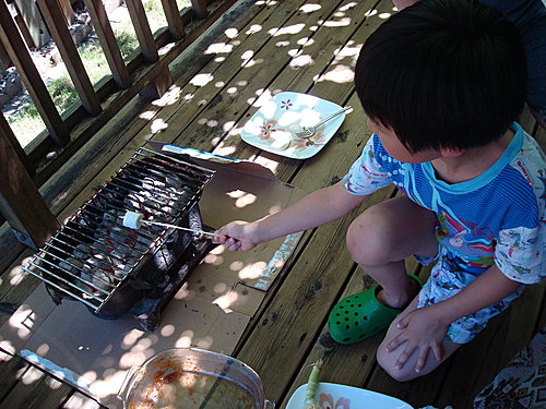 等到P爸忙完,P家人就到後院升火烤肉。因為天氣熱,吃完烤肉後,P仔們還可以玩玩水,消消暑氣。