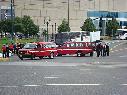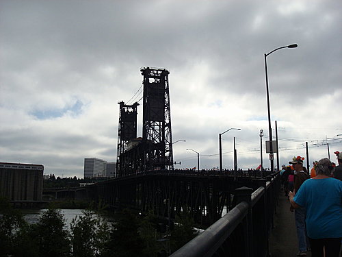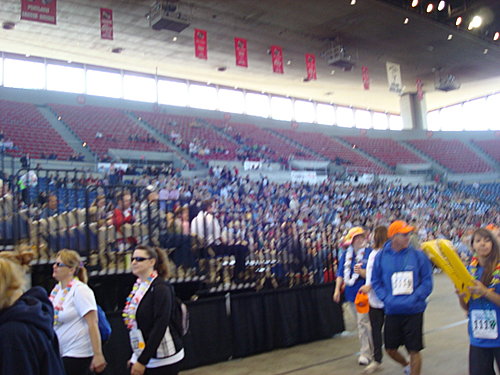 參加的人數很多,所以活動當天,早上七點就開始受理報到。P媽、P姐和P灝一早就起床準備,然後搭輕鐵進市中心。在報到處領取了號碼牌、活動的T恤、帽子和背包。等穿戴齊全,再用現場提供的塑膠花做些裝飾後,P媽、P姐和P灝就跟著參加活動的人群前往集合的運動場,等待遊行開始。