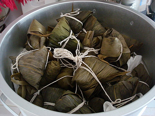 趕在端午節前的星期日,P媽趕緊刷洗粽葉,包幾串粽子應景。