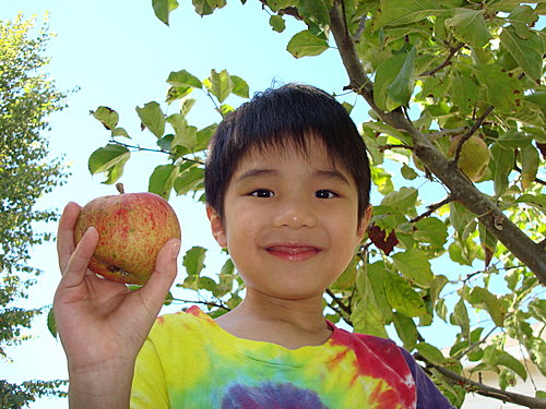 但蘋果掛得老高的,P媽即便踮著腳,奮力伸直手臂,也搆不著任何一顆蘋果。當然懶人P媽是不會大費周章的從車庫扛出重重的梯子來摘蘋果。