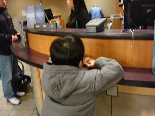 小P灝自己排隊存錢,小個看不到櫃檯,行員還是很有耐心的跟他講解。
