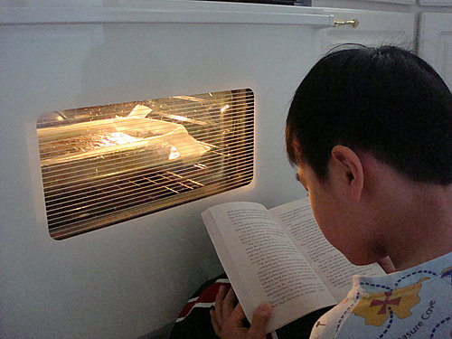 在烤箱旁邊看書的P哥(因為味道很香,可以提振精神。哈!)