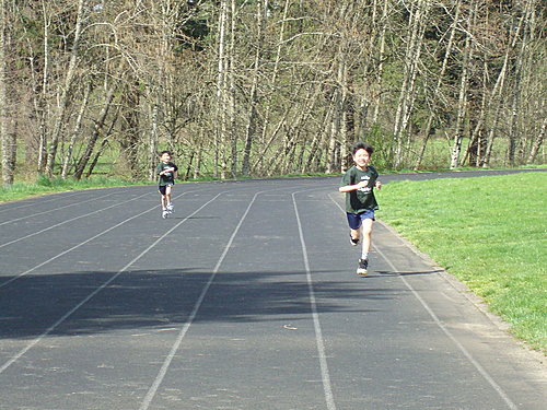 中午過後,太陽露臉,溫度突然回升,站在陽光下,感覺無比舒暢。所以P仔們放學回到家,P媽馬上要兩人換上短褲,到P姊的學校操場跑上幾圈,順便接P姊放學回家。