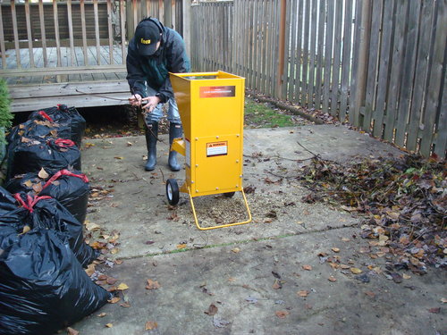 由於P家院子的樹木年年在成長茁壯,所以枯枝落葉的問題也一年比一年更加嚴重。平日等待兩星期一次的收集車來收集,總是要到春天之後才能完全消化堆積在後院的枯枝落葉。所以P爸考量了很久,最後終於決定買一台碎葉機,希望經由碎葉機的碾攪過程,讓枝葉的體積減至最小,這樣或許只要送一兩次收集車就可以解決P家所有的落葉。