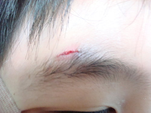 昨天上小提琴課時,小提琴老師看到P哥眉毛上的OK繃,問P哥怎麼回事?P媽愣了一下,因為P媽完全不知道P哥受傷了。