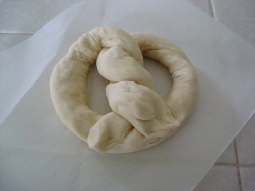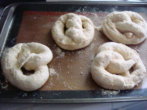 放假在家的第一天,P姐請P媽做扭結麵包(soft pretzel),因為她突然很想吃。所以P媽發了麵,讓P仔們幫忙做了扭結麵包,烤好後已是午餐時間,所以大家就把扭結麵包當午餐。