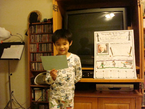 可是必須做裝扮。P家因為沒有甚麼人物的裝扮服,P媽也懶得花功夫做,所以請P灝扮演巴哈(因為家裡有小提琴,小P灝當時也正好學巴哈的曲子。)裝扮服就穿蕾絲襯衫和西裝褲,非常的簡單。(有說要做一頂假髮,不過小P灝從頭到尾都堅拒。)