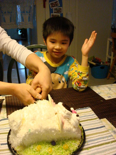 兔子皮毛??哈哈!P家人對奶油是瘋狂喜愛的,但這個實在是太過甜,大家居然都刮除掉,而且最重要的是甜到居然沒人想吃蛋糕上的糖果。另外椰子絲太多,兔子毛是白椰子絲,青草地是綠椰子絲........偏偏P爸和P仔都不吃椰子的,P媽雖也不喜歡,但丟了又覺可惜,.........結果全下肚之後,噁心了好一陣子。