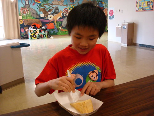 學校賣的這個flan,吃起來的口感不是滑嫩那種的,反而有點像P媽有時烤布丁時烤X敗的口感。如果不小心出現那種烤X敗比較厚實口感的布丁,P爸和P仔們會一口都不吃。但學校賣的P哥和P灝卻直說好吃得不得了,因為超級甜!