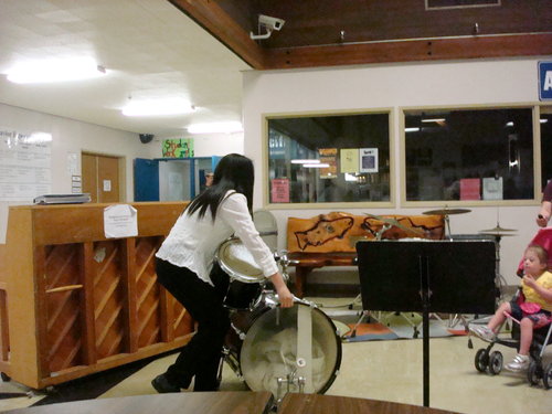 表演地點從舞台移到穿堂,所以P姐正在搬樂器。