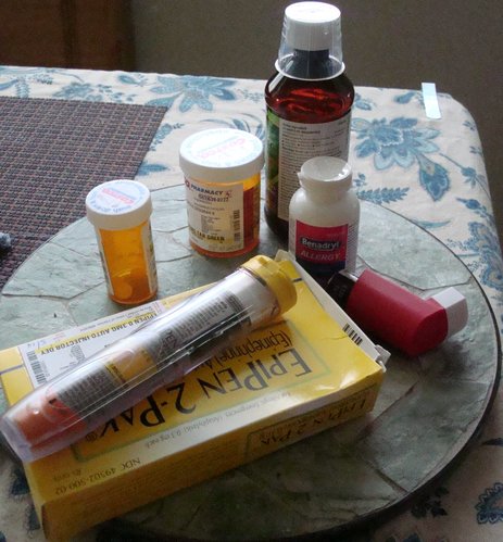 P哥必需服用的藥物。其中Epipen是預防萬一之用,雖然P哥已經練習扎針,但P媽還是希望不要有用到的一天。