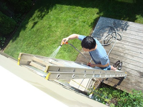 以往百葉窗都是P媽一片一片擦的(春天剛開始時,P媽已經擦過一次了),這次P爸決定整個拆下來用強力沖水機洗洗看。